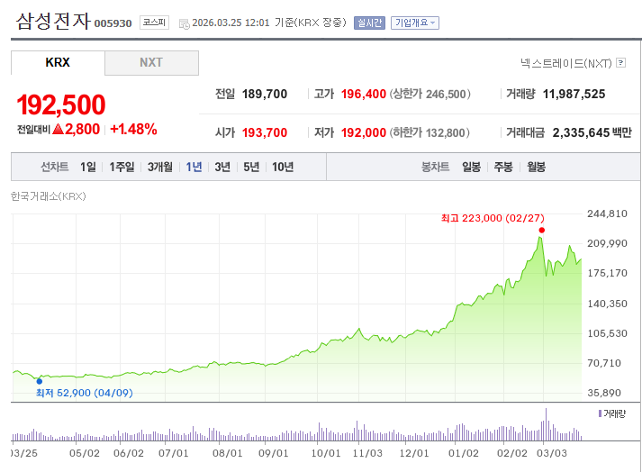 2026년 3월 현재 애널리스트 36명이 "매수" 의견을 제시하고 있으며, 12개월 평균 목표주가는 약 129만 원이다. 최고 목표주가는 193만 원(대신증권)이다. 다만 반도체 주가는 실적 사이클에 민감하므로 분기 실적 발표 전후 변동성이 클 수 있다.