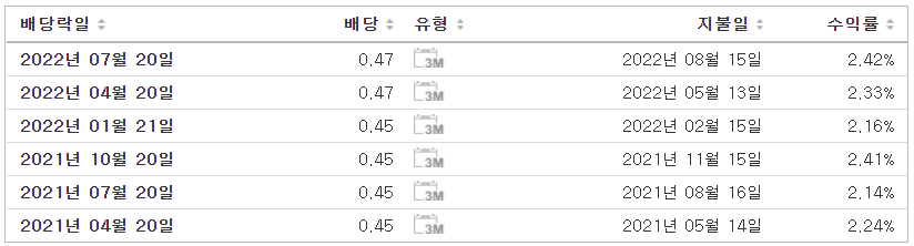 분기별 배당이고 분기당 배당금은 주당 $0.47입니다.