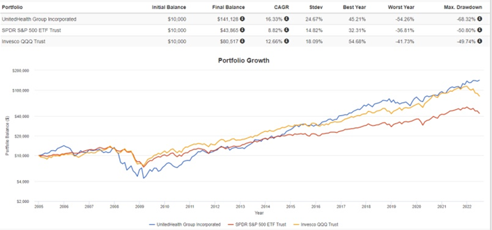 UnitedHealth Group의 연평균 수익률 16.33%는 QQQ(12.66%) 및 SPY(8.82%) 보다 훨씬 낫습니다.