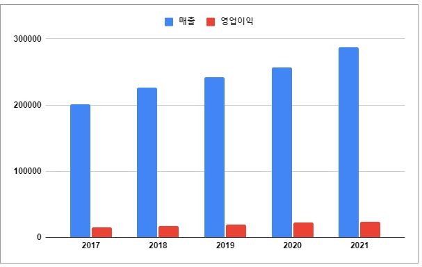 2017년부터 2021년까지 매출은 매년 9.38%, 영업이익은 매년 12%씩 증가합니다.
