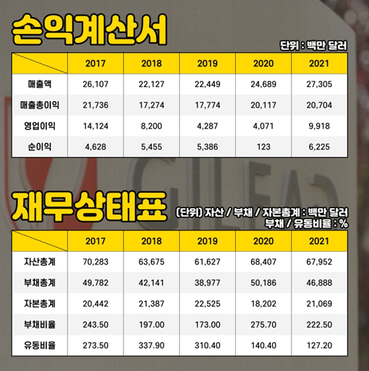 매출과 영업이익 측면에서 보면 2017년 최고 매출과 영업이익을 기록한 후 2020년에도 계속해서 하락하다가 2021년에는 크게 반등할 것입니다.
