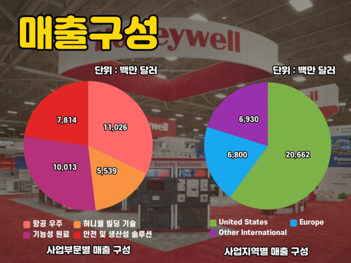 각 사업부문별 수익의 관점에서 항공우주는 동력장치, 추진장치, 엔진 제어장치 등의 항공기 제품과 제어시스템, 통신 및 항법레이더 등의 소프트웨어를 개발, 제조, 판매하는 것을 말하며, 건축 기술. 센서, 스위치, 에너지, 화재 등의 원격 관리를 제공하는 장치 및 시스템을 말합니다.