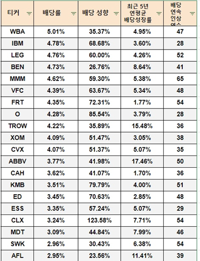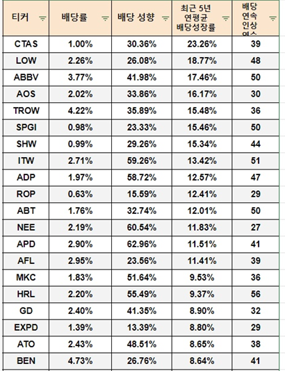 이제 배당귀족의 배당주 상위 20개 종목과 배당성장주 상위 20개 종목을 살펴보겠습니다.