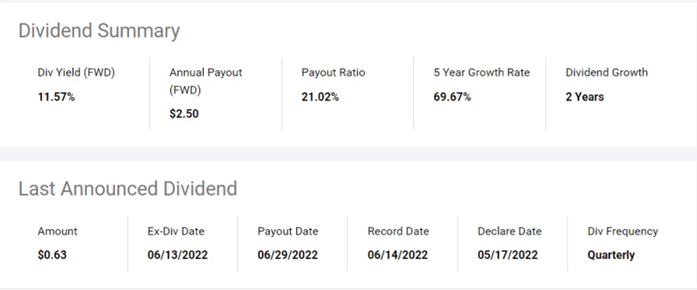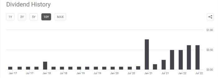 문제는 지난 10년간 배당금 지급 이력을 보면 배당금이 최근 2년 동안만 증가했다는 점입니다.