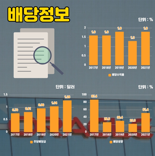 2021년까지 배당 수익률이 1.8%이고 주당 배당금이 $1.28, 배당성향 51.4%이며 13년 연속 배당 성장했습니다.