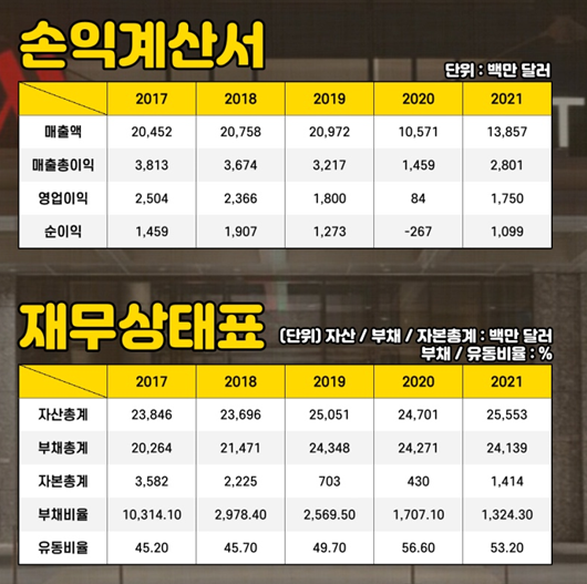 2017년부터 2021년까지의 손익계산서를 보면 2019년까지 3년 연속 안정적인 매출을 유지해온 메리어트가 2020년 매출이 절반으로 줄었고, 순이익은 적자전환해 큰 폭의 하락세를 보였습니다.