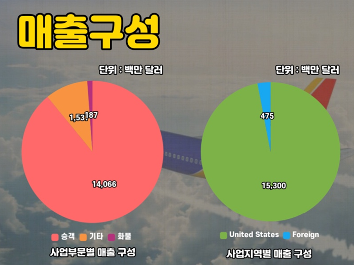 먼저 사우스웨스트 항공 사업부의 매출 구성을 살펴보면 매출이 여객, 기타, 화물의 3개 부문에서 발생하고 있음을 알 수 있습니다.