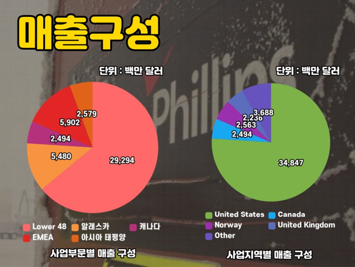 먼저 ConocoPhillips의 사업부별 매출 구성을 보면 Lower 48, 알래스카, 캐나다, EMEA, 아시아 태평양의 5개 부문에서 매출이 발생하고 있음을 알 수 있습니다.