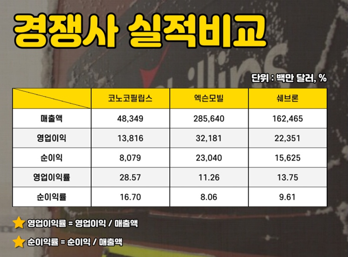 그러나 2020년에 셰일 오일 기업인 강초를 11조 원에 인수한 코노코필립스는 2020년 유가상승으로 2021년 막대한 영업이익을 기록했습니다.