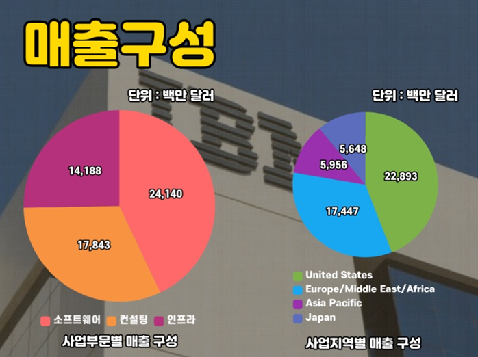 소프트웨어 매출은 전체 매출의 약 43%를 차지했고 컨설팅과 인프라 매출이 뒤를 이었습니다.