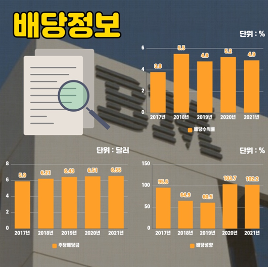 2021년까지 배당 수익률이 4.9%이고 주당 배당금은 $6.55, 배당성향은 102.2%이며 27년 동안의 배당 성장했습니다.