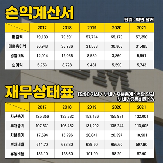 매출과 영업이익 측면에서 보면 2017년과 2018년 최고 매출과 영업이익을 기록한 이후 2021년까지 매출과 영업이익이 감소세를 이어갔습니다.