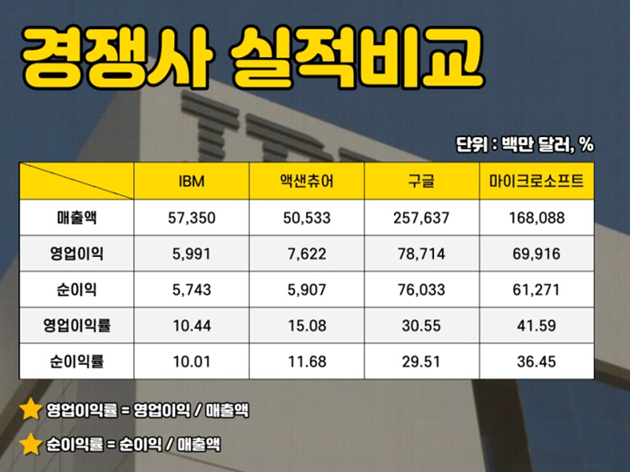 IBM의 경쟁업체에는 액센츄어, Google 및 Microsoft가 있습니다.