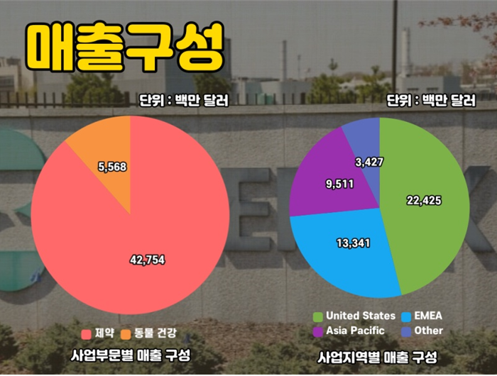 의약품 매출은 약 88%로 매출에서 가장 큰 비중을 차지했으며 나머지는 동물 건강 제품 매출이었습니다.