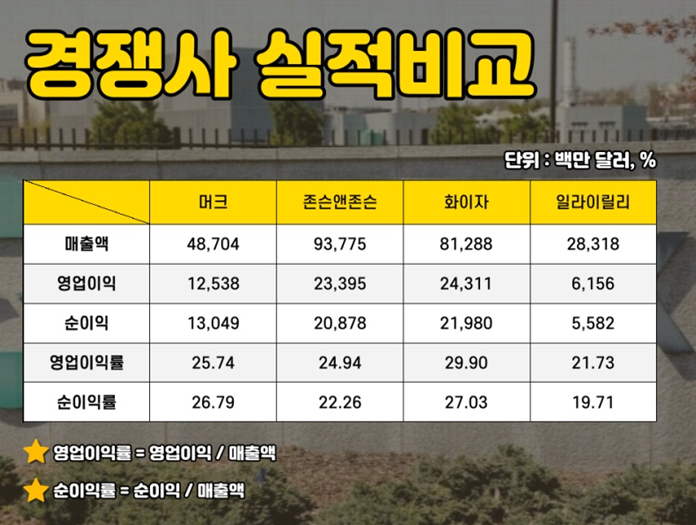 먼저 머크 사업부의 매출 구성을 보면 의약품과 동물 건강이라는 두 가지 영역에서 매출이 발생하고 있음을 알 수 있습니다.